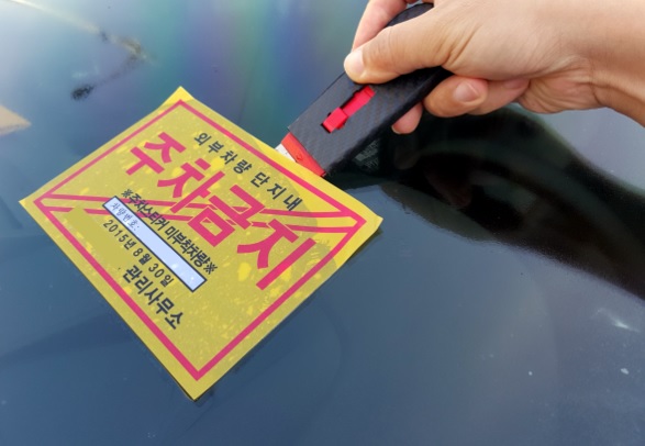 차량 유리에 주차금지 스티커가 붙었다고 칼로 긁으시면 절대 안 됩니다.