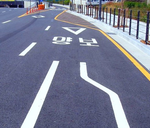 도로가 합쳐지는 합류 차선에 꼭 그려져있어요.